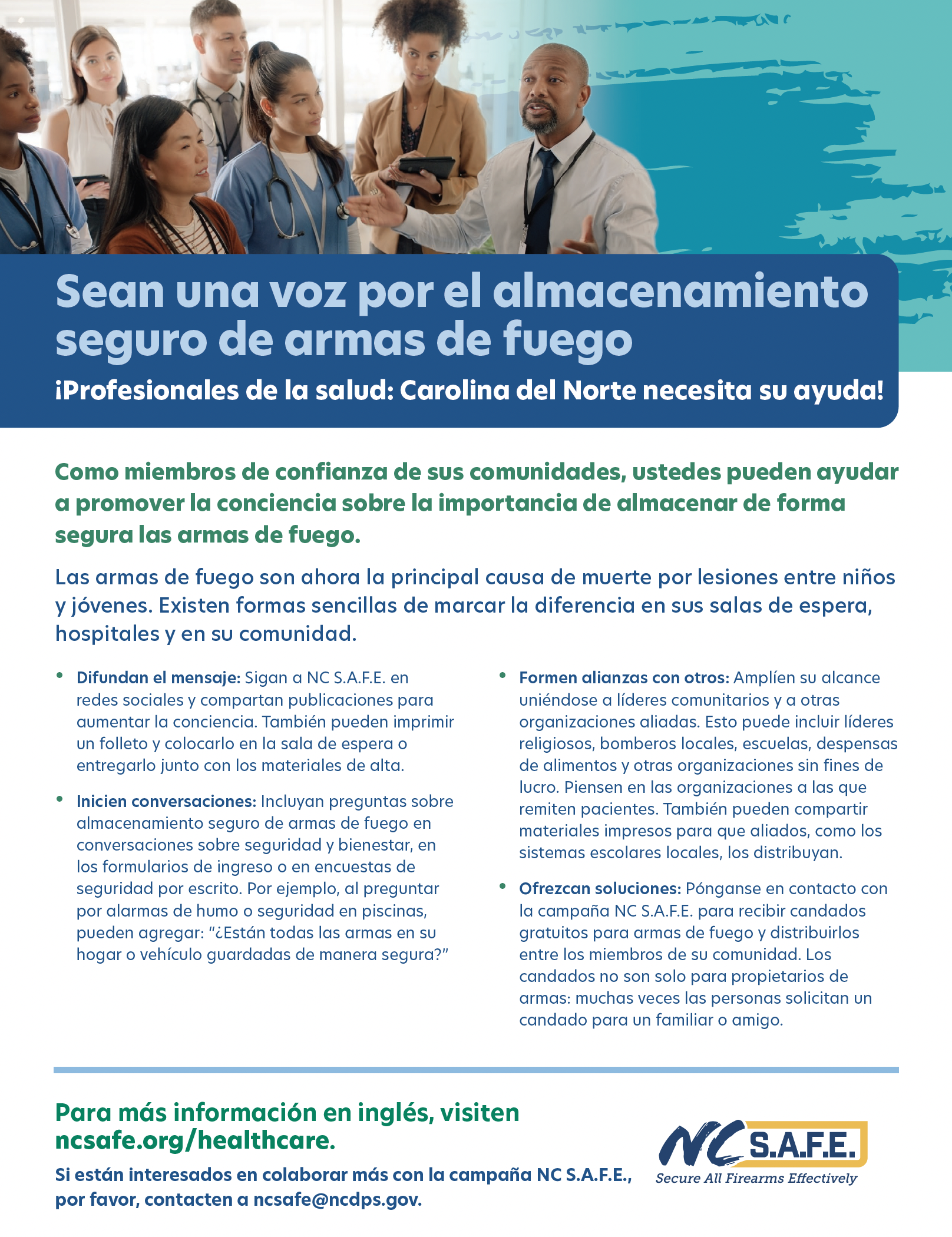 Este folleto ofrece a los profesionales de la salud y al personal de primeros auxilios maneras prácticas de compartir con sus comunidades el mensaje sobre el almacenamiento seguro de armas de fuego.