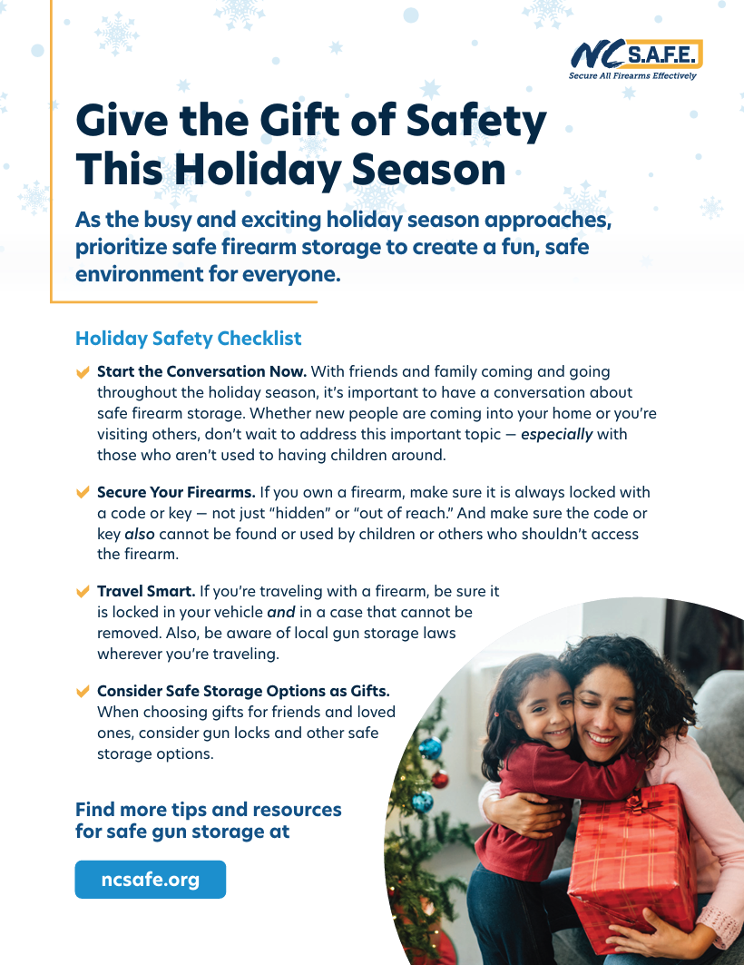 This flyer shares simple tips that parents can use to help prevent gun-related tragedies. It lists secure gun storage options, offers guidance for keeping guns secured and out of sight in vehicles, and encourages open conversations with family, friends, and community leaders to keep children safe.