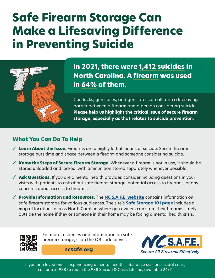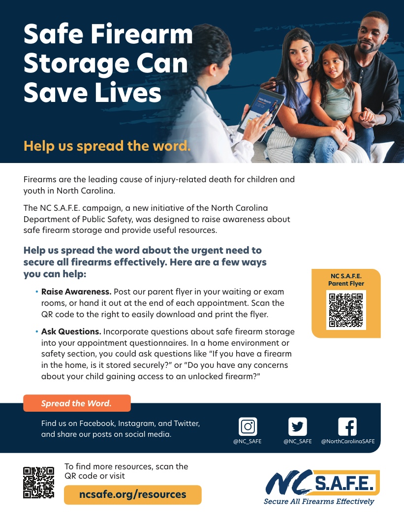 This flyer encourages pediatricians to promote safe gun storage to help save children’s lives. It suggests simple ways to raise awareness among parents, like displaying the parent flyer in exam rooms and waiting rooms and asking safety questions during visits.