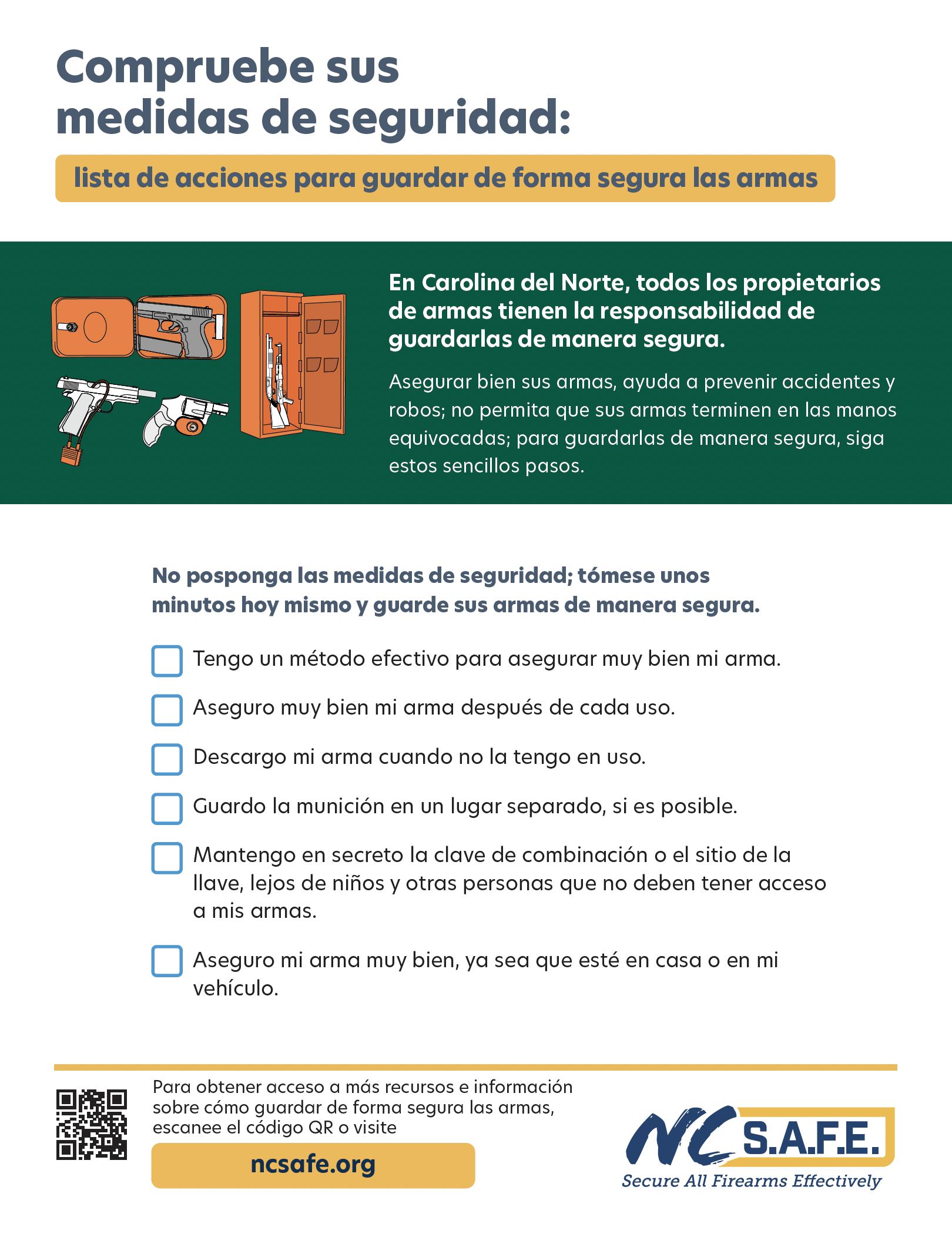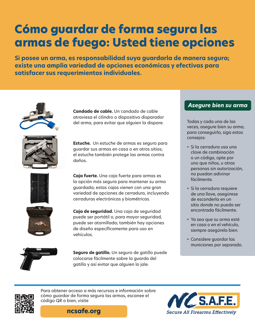 Este volante anima a los dueños de armas de fuego a mantenerlas bajo llave y muestra varias opciones para guardarlas de forma segura. También ofrece consejos prácticos para mantenerlas protegidas.